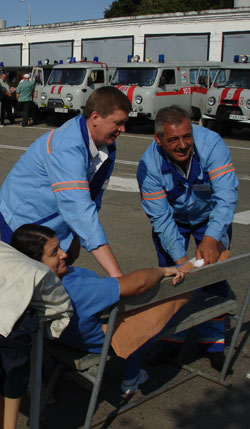 ![]() …На полигоне — готовность № 1. В строю — автомобили СМП с экипажами. Команды настроены по-боевому. Впереди 3 тура из 6 конкурсов, наивысшая суммарная оценка за их выполнение — 26 баллов. Первое испытание — тестирование в ГАИ по правилам дорожного движения. Водители волнуются, словно мальчишки: компьютер скидок не делает. Не знаешь — долой 2,5 балла. Многие экипажи с заданием справились, а «забуксовавшим» вручили «утешительные призы» — брошюры ПДД с автографом начальника облУГАИ Валерия Крупского и его пожеланием: «Можно правила знать, можно правила сдать, главное — их соблюдать». Пока шло тестирование водителей, экзамен держали автомобили — от строгого глаза госавтоинспектора Владимира Саприко не ускользнула ни одна деталь: внешний вид, эмблемы, надписи, комплектность машины, наличие радиостанции, жилетов со светоотражающими элементами и, конечно, техсостояние. Без замечаний прошли конкурс экипажи Житковичской, Лоевской, Жлобинской, Светлогорской ЦРБ, ГОКБ и автобазы СМП Гомеля — высший балл 7! Облегченно вздохнув после сдачи ПДД, водители вернулись на полигон. Фигурное вождение — высший пилотаж водительского мастерства. Виртуозное владение машиной и ювелирную точность на «стоп-линии» и «змейке», в «круге» и «колее», при движении задним ходом и в др. упражнениях показал без единого штрафного очка экипаж Петриковской ЦРБ — Василий Малевич (3 мин. 34 сек.) и Михаил Туровец (4 мин.). Как часто им приходится проявлять эти качества на сельских дорогах, когда «скорая» мчит на вызов! Быстрее всех (3.02), и тоже без штрафа, справился с заданием Александр Турковский из Кормянской ЦРБ. Он-то и стал победителем в этой номинации, однако рекорд своего напарника Геннадия Усачева — 1.49, установленный на первых областных состязаниях водителей СМП, так и не побил. Конкурс по ремонту автомобиля особых эмоций не вызвал. Заменить «пробитое» колесо для профессионала — не велико испытание. Если при этом, конечно, не забудешь выполнить 20 действий — жюри отмечало каждое. Всего за 2 мин. 36 сек.(лучший результат и победа в номинации) управились Юрий Лазаренко и А участников ждали новые испытания. Всего 5 минут дали судьи, чтобы обнаружить 10 технических неисправностей, при которых эксплуатация автомашины запрещена. Высший балл у 3 команд: экипажи 5-й бригады СМП из Турова (Житковичская ЦРБ) — призеры прошлых состязаний Валентин Соболь и Леонид Карась, Хойникской ЦРБ и автобазы СМП Гомеля нашли все 10. Сергею Жаборовскому и Валерию Венгуре из Лельчицкой ЦРБ удалось быстрее всех устранить технеисправность автомобиля и завести двигатель: за 1 минуту вместо 10 определили: нет искры — повреждена электропроводка… Конкурс по оказанию медпомощи пострадавшим в ДТП (этими навыками должен владеть любой водитель, в т. ч. и «скорой») судил со всей строгостью и профессионализмом зам. главврача ГГКБ СМП Дмитрий Попков. Непростое задание досталось водителю Мозырской ССМП Ю. Хоменко: ожоги гортани и первая помощь при закрытом переломе голени. Юрий выполнил его отлично — победа в номинации. В общекомандном зачете жюри присудило 1-е место экипажу Петриковской ЦРБ — водителям Михаилу Туровцу и Василию Малевичу (24,8 балла). На 2-м — Вячеслав Будишевский и Владимир Джум (23,4) из Ельской ЦРБ. Всего 0,15 балла уступили им Валерий Даниленко и Юрий Атрощенко из Добрушской ЦРБ. Победите