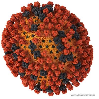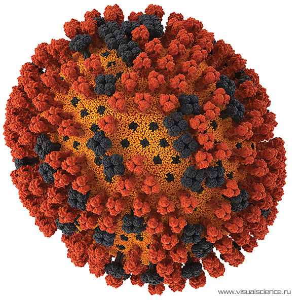 ![]() В модели вируса гриппа A/H1N1 использованы данные рентгеноструктурного анализа о строении белков вириона. При этом третичная структура поверхностных белков (гемагглютинин и нейраминидаза), на основе которых происходит классификация подтипов вируса, соответствует именно «свиным» подтипам H1 и N1. Строение самой частицы и плотность белков на ее поверхности соответствует изображениям вируса, полученным методом криоэлектронной микроскопии, а молекулы фосфолипидов, входящие в состав мембраны, детализированы до атома. Данная модель позволяет получить изображения размером до 30 000×30 000 пикселей, что достаточно для печати фотографического качества 3×3 м. Вирусы гриппа относятся к семейству Orthomyxoviridae. Они патогенны для человека, некоторых млекопитающих и многих птиц. У человека и млекопитающих вирус поражает верхние дыхательные пути, а у птиц инфекция затрагивает преимущественно кишечник. Эти вирусы характеризуются высокой изменчивостью и широким кругом хозяев. Заболевание гриппом периодически распространяется в виде эпидемий и пандемий. Тяжесть и характер течения заболевания варьирует в зависимости от штамма вируса. Частицы вируса гриппа плейоморфны, однако наиболее распространены частицы сферической формы. Их размеры варьируют в пределах от 80 до 120 нм [1]. Снаружи частицы покрыты липидной мембраной, сформированной из мембраны зараженной клетки. В нее включены белки — гемагглютинин (HA) и нейраминидаза (NA), ответственные за узнавание клетки-мишени, проникновение внутрь и распространение вновь образованных частиц. Также мембрана вирусной частицы гриппа содержит белковые каналы (M2), необходимые для распаковки вируса внутри клетки. Под оболочкой вирусной частицы находятся белковые структуры, окружающие генетический материал вируса. Внутренние компоненты вирусной частицы (нуклеокапсид) с мембранной оболочкой и поверхностными белками связывает белок М1. Белок NP связан непосредственно с 8 молекулами РНК генома. Белки PB1, PB2 и PA необходимы для копирования генетического материала вируса. Помимо этого, вирус гриппа синтезирует два белка, отвечающие за противодействие интерфероновой системе противовирусной защиты (белок NS1) и за транспорт генетического материала вируса из ядра в цитоплазму (белок NS2, также называемый NEP) [2]. Вирус гриппа связывается с мембраной клетки-мишени и проникает в цитоплазму. За связывание с мембраннными рецепторами и проникновение внутрь клетки отвечает белок гемагглютинин. Он состоит из трех одинаковых субъединиц. Название гемагглютинин получил благодаря тому, что в искусственных условиях он может провоцировать агглютинацию эритроцитов [3,4]. Сразу после проникновения в клетку вирусная частица оказывается в составе небольшой мембранной органеллы — эндосомы, внутри которой постепенно возрастает концентрация протонов (понижается pH). Через каналы в вирусной мембране, образованные белком М2, протоны проникают внутрь вирусной частицы, что вызывает ее распад и высвобождение нуклеокапсида [5]. Генетический материал вируса попадает в ядро клетки, после чего запускается синтез вирусных белков и новых копий вирусного генома. На матрице геномных РНК вируса, оказавшихся в ядре, синтезируются их копии, которые выходят в цитоплазму, где для синтеза вирусных белков используются рибосомы зараженной клетки. Ге